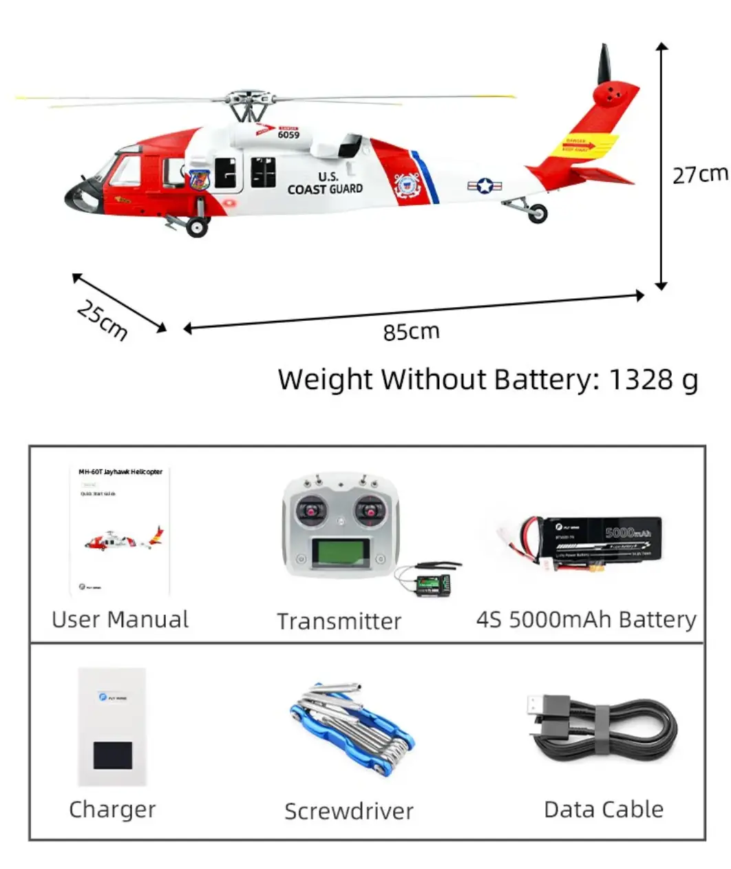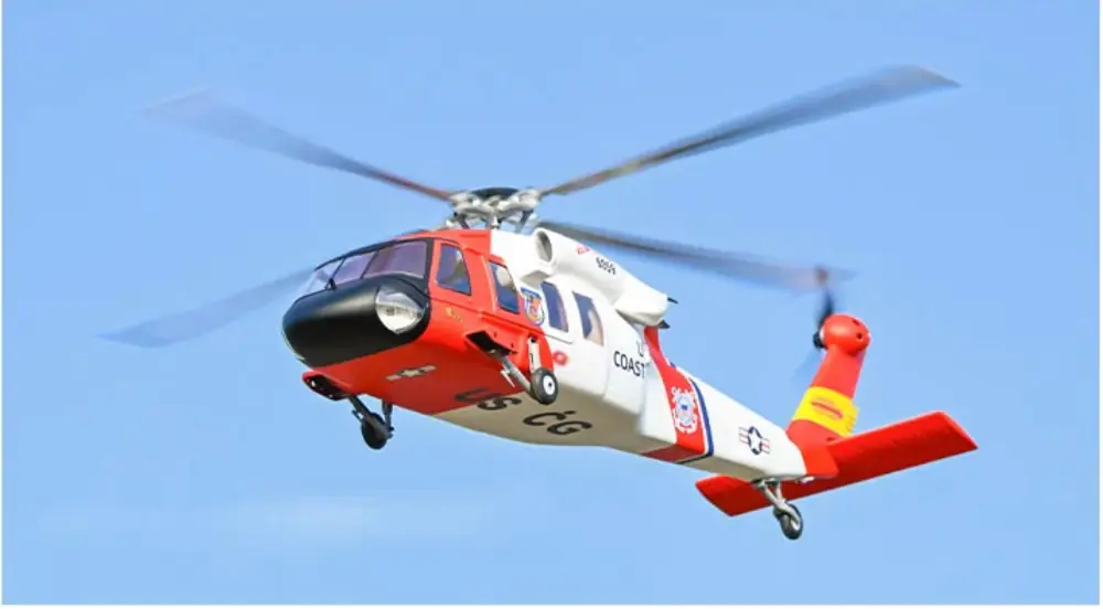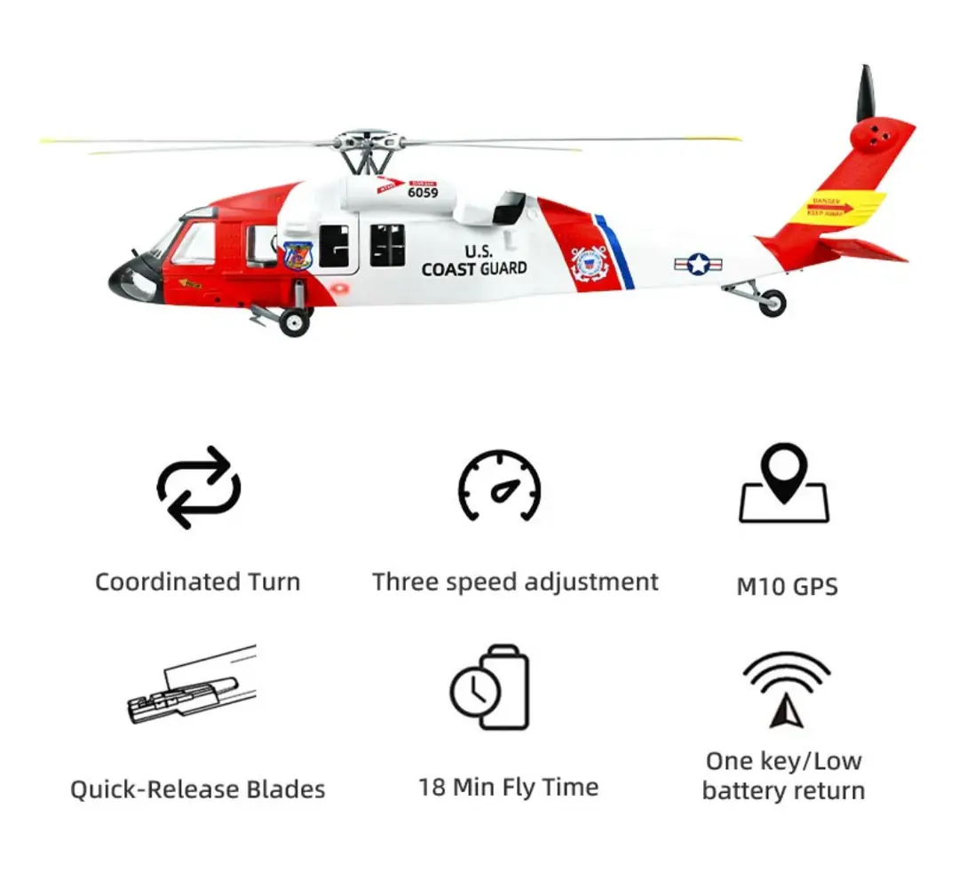MH-60T Jayhawk modeli; gerçekçi darbe emici iniş takımı, simüle edilmiş dört kanatlı metal rotor başlığı, uçuş stabilitesini artıran yatay dengeleyiciler, şeffaf kokpit kanopisi ve yüksek gerçekçilikte boya detaylarına sahiptir. Tüm bu detaylar, helikopterin gerçek modele çok daha yakın görünmesini sağlar.