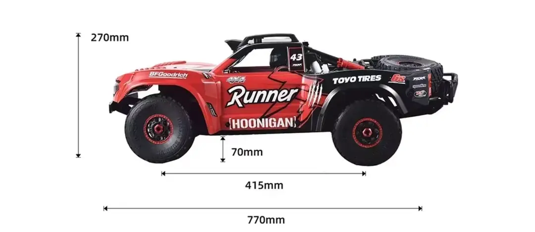 FSR 1/7 TT High-Speed Off-Road RC Short Course Truck, maksimum hız, üst düzey dayanıklılık ve profesyonel sürüş deneyimi sunmak için tasarlanmış dev ölçekli bir RTR (Ready-to-Run) RC off-road aracıdır. 100 km/s üzeri hız kapasitesi sayesinde hem yarış hem ekstrem arazi kullanımı için ideal bir performans sunar.