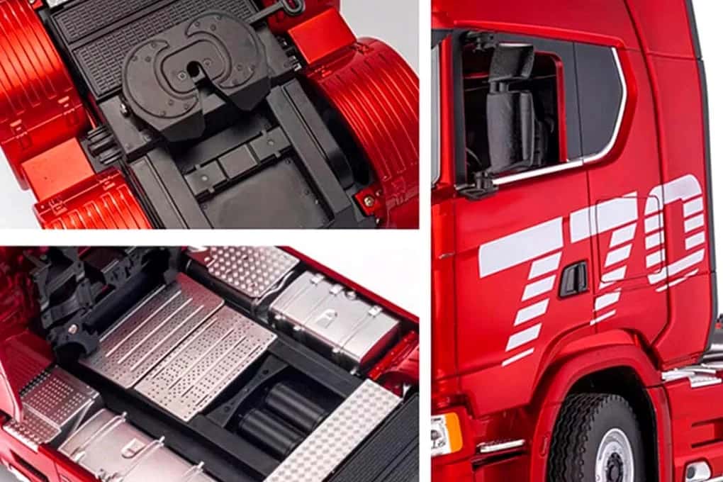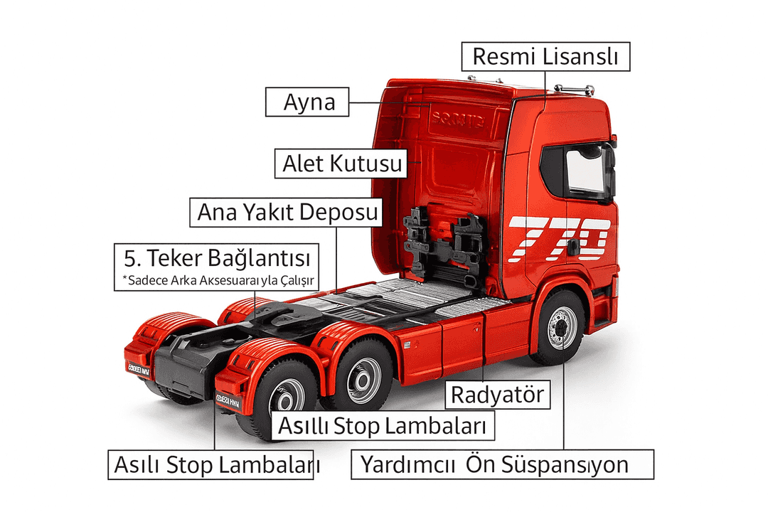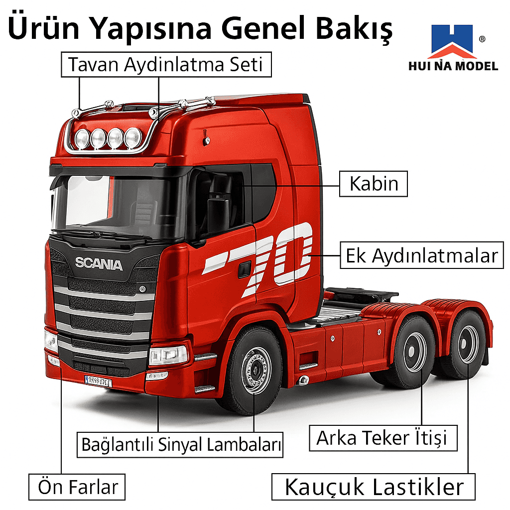 Huina Scania 770S, yüksek detaylı iç mekân tasarımı, fonksiyonel aynalar, uzaktan kontrol edilebilen 5. teker bağlantısı ve gerçek kamyon şasisi ile dikkat çeker. Gerçeğe en yakın RC tır deneyimini yaşatmak için her ayrıntı özenle tasarlanmıştır.