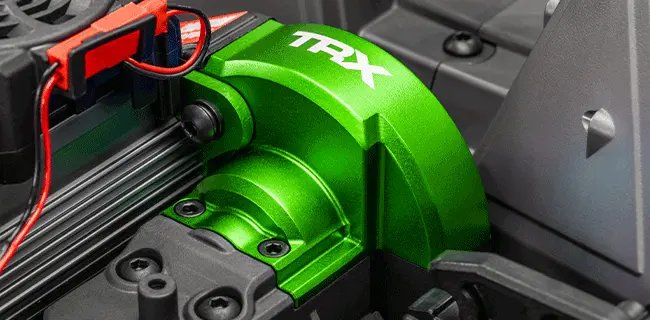 Alüminyum şanzıman kapağı, aracın gövde rengine uyumlu tasarımı ve lazerle işlenmiş Traxxas logosu ile hem şıklığı hem dayanıklılığı bir araya getirir.