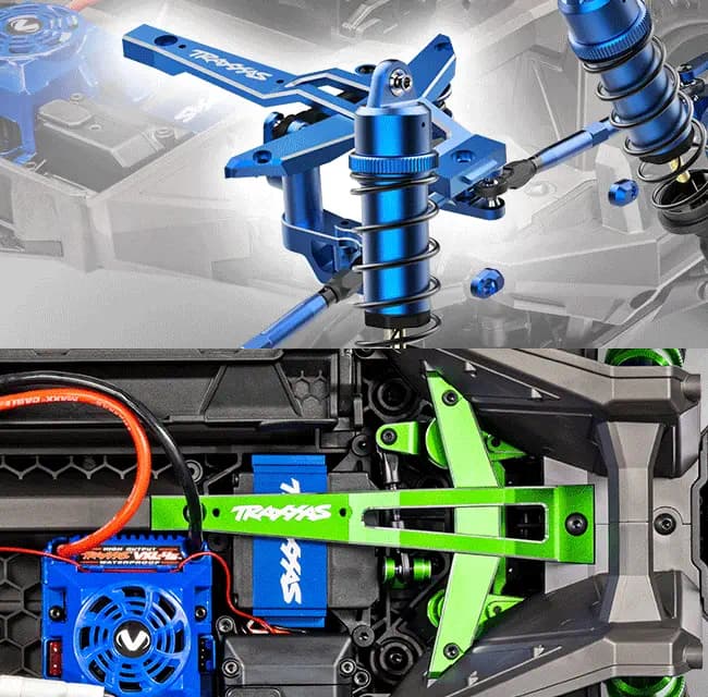 Parlak anodize kaplama, yüksek teknoloji görünümüne katkı sağlar ve lazerle işlenmiş Traxxas logoları ile orijinalliği vurgular.